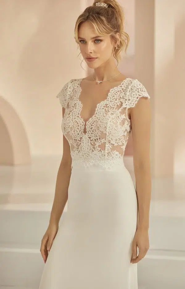 Ce top de mariée à manches courtes et col en V a été conçu avec une broderie en dentelle délicate.