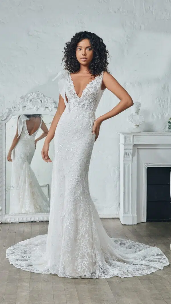 Avec ses détails en dentelle délicate et sa coupe ajustée qui épouse parfaitement la silhouette, cette robe de mariée se distingue par son élégance intemporelle. Le nœud délicatement noué sur l’épaule apporte une touche de romantisme, tandis que la traîne en dentelle sublime chaque pas que vous ferez. Le décolleté en V ajoute une touche moderne et glamour.