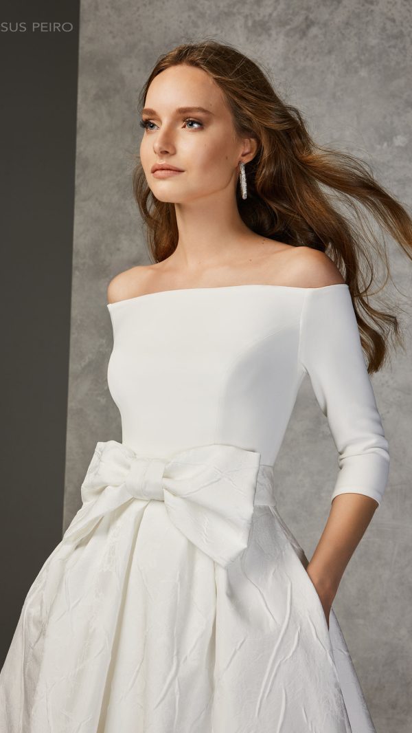 Robe de mariée avec manches 3/4 en crêpe. Jupe ouverte avec nœud en taffetas.
