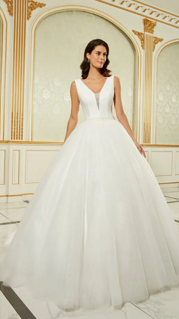 Kimberly est une robe princesse. Le bas de la robe est recouvert d’un tissu pailleté. Le décolleté et la ceinture sont rehaussés de perles. Son laçage permet de l’ajuster facilement. Une véritable robe de princesse des temps modernes !