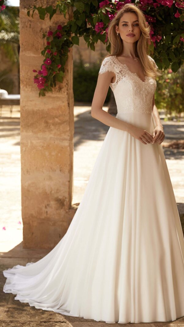 Paula est une robe de mariée trapèze avec de jolies manches courtes. Cette robe de mariée, faite en dentelle et en mousseline, séduit grâce à son décolleté en V.