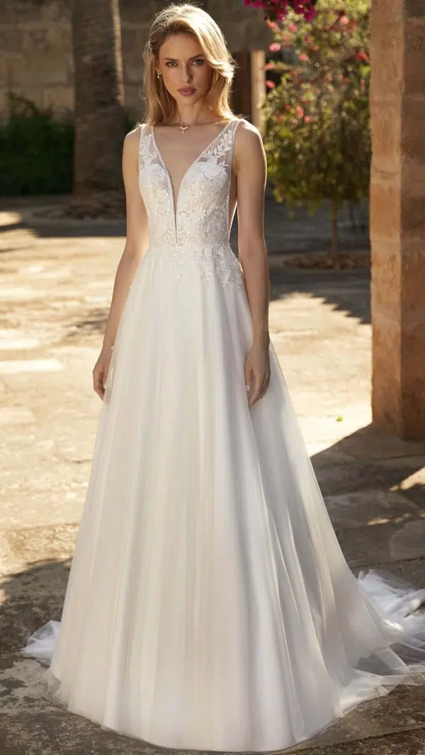 Polina est une sublime robe de mariée sans manches. Ce modèle romantique présente un décolleté plongeant et un dos en V.